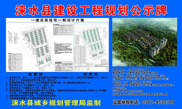 一渡龙安住宅一期(01-01地块)建设项目设计方案于2018年3月31日在县规划局召开方案审查会,并已通过方案审核,现申请予以公示。预计公示日期:2018年4月8日至2018年4月22日,共计15天。