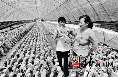 9月7日,涞水县赵各庄镇淮北村村民在查看香菇长势。该镇2012年以来,结合山区地形、气候等因素,引进适宜的种植、养殖项目,并聘请技术人员跟踪指导,使村民收入显著提高。